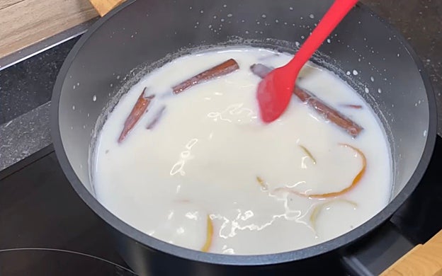 Apartamos un vaso de leche y la reservamos. El resto de la leche la ponemos en una olla junto con las pieles de la naranja y el limón y una rama de canela. Añadimos también el azúcar y una cucharadita de esencia de vainilla. Lo llevamos a ebullición y a continuación, mantenemos 5 minutos a fuego bajo.