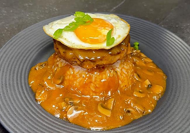 Para el emplatado, cocinaremos un huevo a la plancha para cada comensal. Pondremos el arroz cocido en un cuenco y lo prensamos ligeramente con una cuchara. Desmoldamos el arroz en un plato y colocamos una burger encima. Añadimos encima una buena cantidad de salsa de champiñones, coronamos con el huevo y decoramos con el tallo de la cebolleta en rodajas. Salamos con una mezcla de chiles y lima en polvo, o sal y pimienta al gusto.
