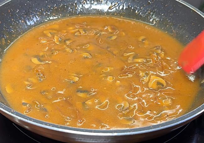 En una sartén con un chorrito de aceite de oliva Virgen Extra, pochamos la cebolleta cortada en juliana durante unos 12 minutos aproximadamente. Mientras tanto pondremos a cocer un vaso de arroz en un cazo con agua y sal. Continuamos añadiendo los champiñones cortados en láminas y los cocinamos unos 8 minutos. Añadimos pimienta negra molida, la salsa de soja, la salsa Worcestershire, el ketchup, la mostaza. Por otro lado mezclamos el caldo con una cucharada de harina de maíz y lo añadimos a la salsa de champiñones mezclando hasta que quede una textura homogénea, pero este paso lo haremos justo antes de emplatar para que no se cuaje de más.