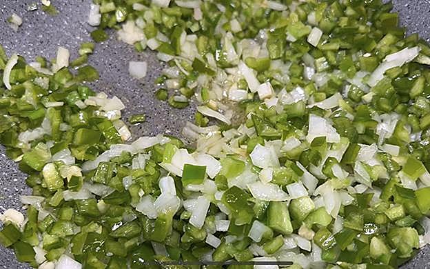 Rehogamos las verduras cortadas en dados pequeños en un chorrito de aceite de oliva virgen extra. Empezamos con el ajo, continuamos con la cebolla y el pimiento y cuando esté pochado añadimos el tomate rallado. Por último añadimos las dos cayenas.