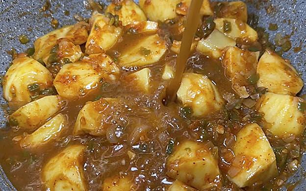 Pelamos las patatas y las cascamos para partirlas en trozos hermosos. Las añadimos a la verdura pochada junto con una cucharada de carne de