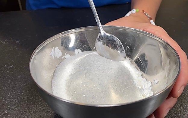 En un bol mezclamos el azúcar glacé y la harina de maíz y removemos bien.