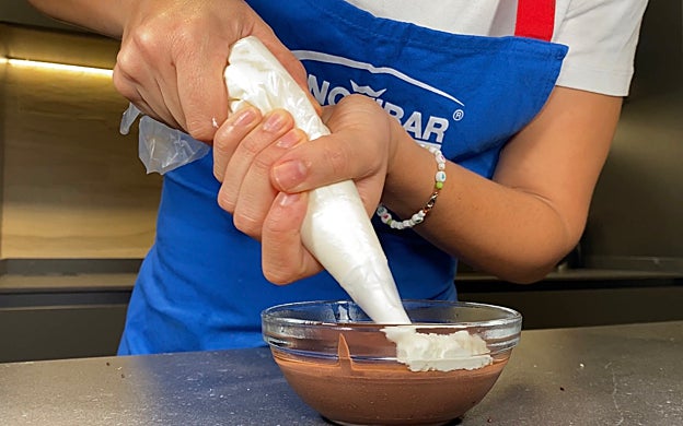 Montamos el resto de la nata que nos ha quedado y ayudándonos de una manga pastelera, la ponemos encima de las natillas. Ponemos unas virutas y unos huevos de chocolate para decorar.