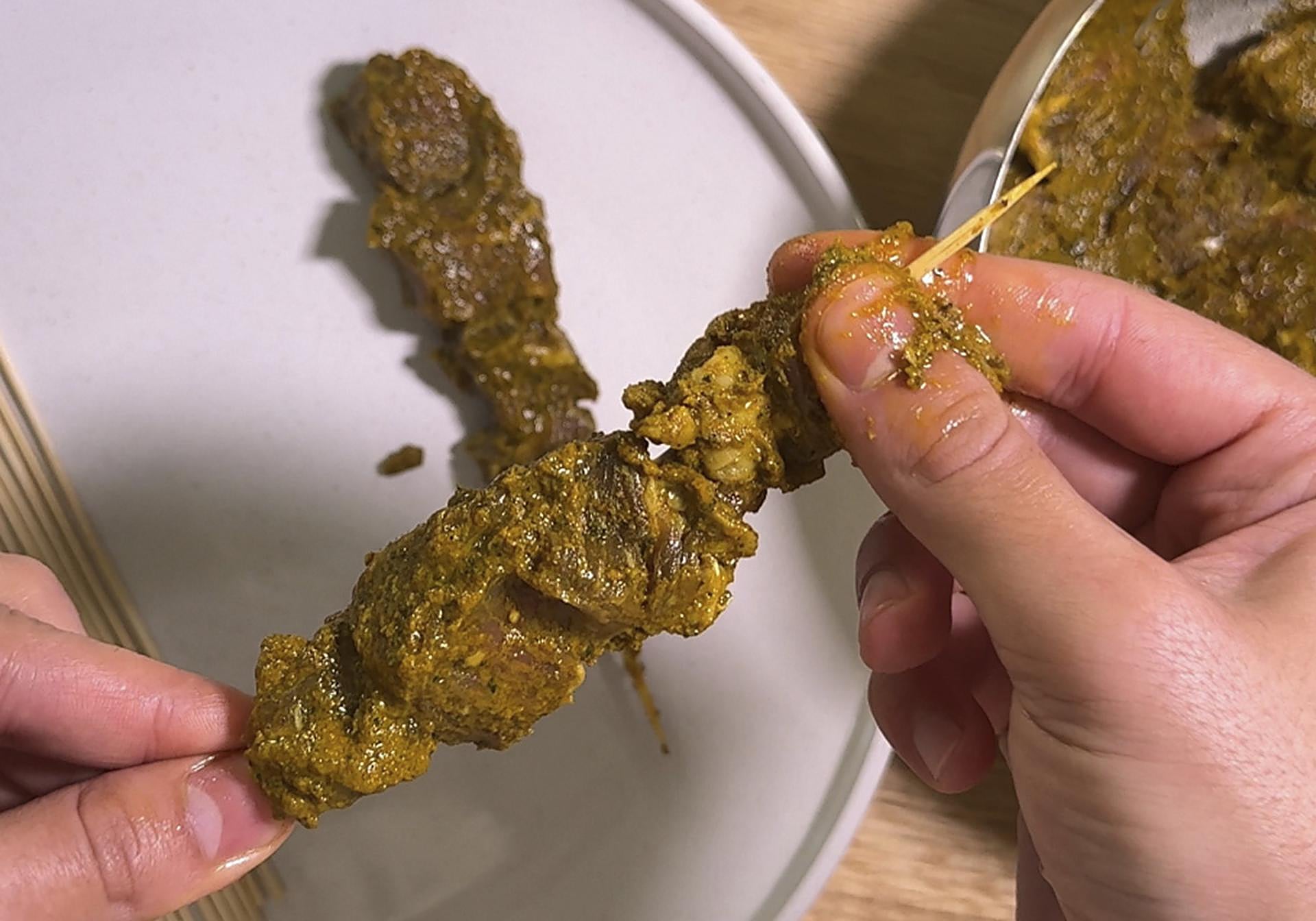 Saca la carne marinada de la nevera y ensarta los dados de carne en palillos formando las brochetas.