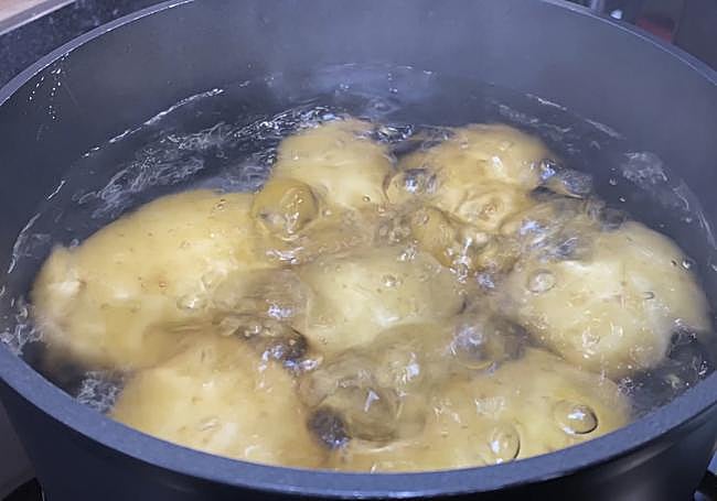 Mientras tanto, cocemos las patatas durante unos 25 minutos con la piel y un poco de sal.