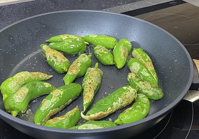 En una sartén caliente con una cucharada de aceite echamos los pimientos verdes y añadimos sal. Los cocinamos a la plancha a fuego medio dándoles la vuelta continuamente para que no se quemen.