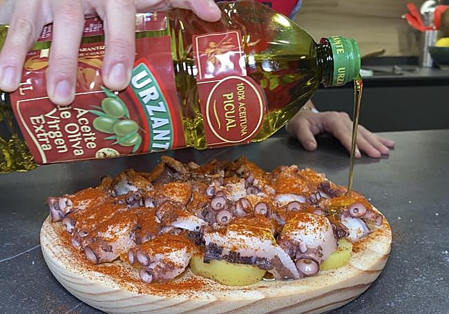 En un plato de madera ponemos las patatas cortadas en rodajas cubriendo toda la base del plato. Cortamos a tijera 3 patas de pulpo en rodajas de aproximadamente un centímetro de grosor. Añadimos por encima pimentón de la Vera, sal en escamas y un buen chorro de AOVE. Colocamos unos pimientos por encima.