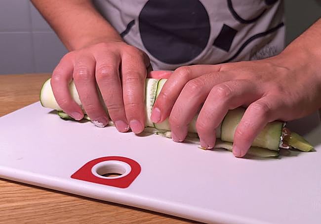 Envuelve el pepino con la ayuda de las manos y presionando para que no se desmonte. Forma un canelón alargado y compacto.