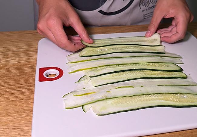 Haz tiras de pepino con la ayuda de una mandolina o un pelador. Tienen que quedar láminas finas para que sean más manejables y se plieguen mejor.