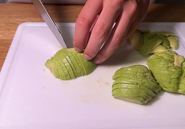 Corta el aguacate en láminas finas.