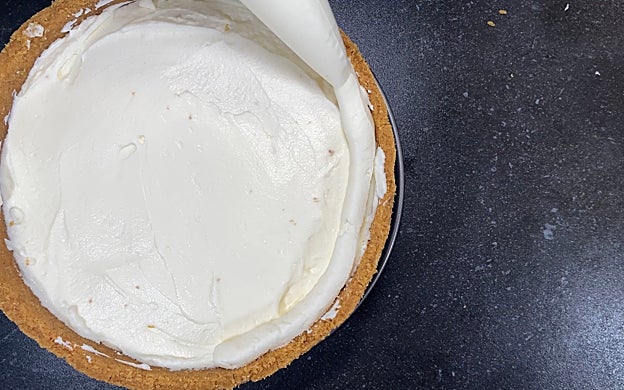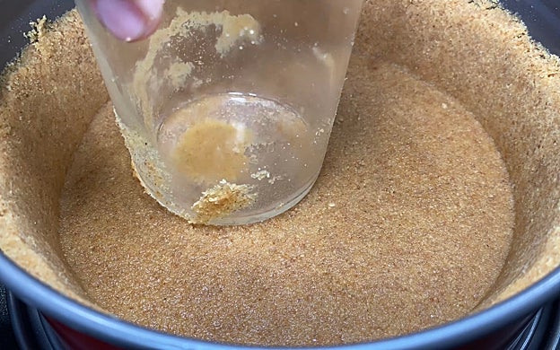 Trituramos las galletas y las mezclamos con la mantequilla derretida en el microondas. Se puede mezclar todo en un procesador de alimentos o a mano. Cubrimos la base del molde y también los laterales. Compactamos bien presionando con un vaso de base ancha. Nuestro molde era de 15 cm de diámetro. Metemos el molde al congelador durante una media hora.