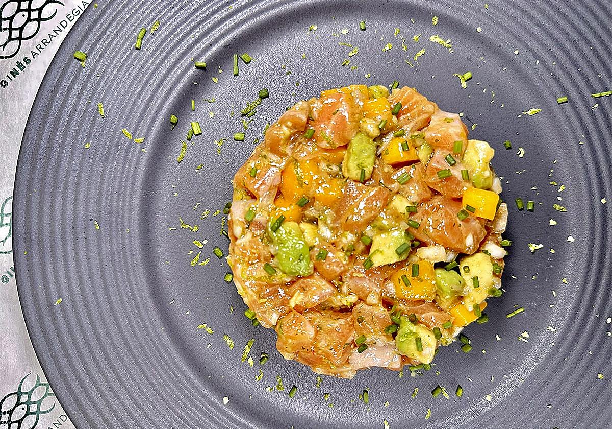 Ingredientes y elaboración de tartar de salmón de Pescadería Gines de Sartén y Cazo