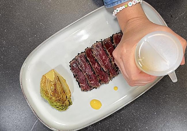 Ingredientes y elaboración de tataki de vaca con cogollos de Txogitxu de Sartén y Cazo