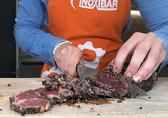 Hacemos una mezcla con las semillas de sésamo negro y blanco. Sacamos el Tataki y lo rebozamos en las semillas por todas las caras. En una sartén con una cucharada de aceite de oliva virgen extra cocinamos el Tataki dos minutos por cada lado. El aceite debe estar caliente pero con cuidado de no quemar las semillas. Lo sacamos a una tabla y cortamos en lonchas lo más finas que podamos.