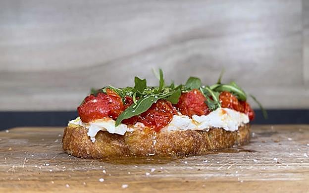 Ingredientes y elaboración de tostada de tomatitos de Sartén y Cazo