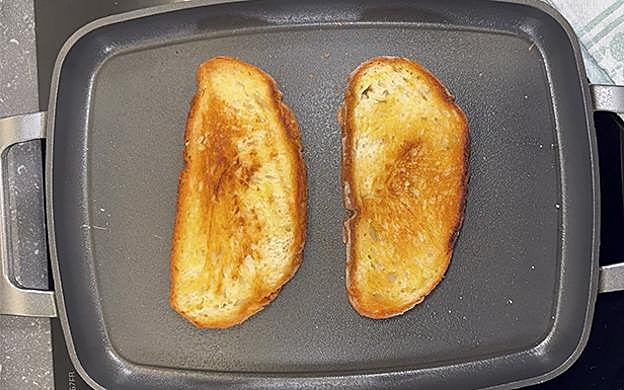 Cortamos unas rebanadas de la hogaza. Ponemos un chorrito de aceite de oliva virgen extra en una de sus caras y las pasamos por la plancha controlando que no se quemen.