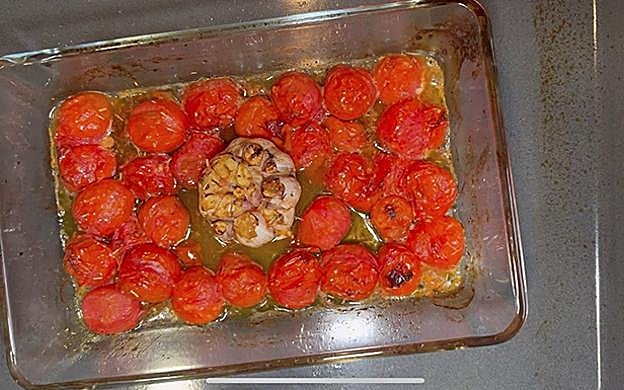 En una fuente de horno ponemos los tomatitos y la cabeza de ajos. Lo llevamos al horno precalentado a 180°C durante 25 minutos.