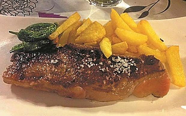 Para empezar, que mejor, que unos buenos fritos. Cuando en la carta leí «nuestras croquetas caseras» tuve muy claro que iba a empezar con ellas la comida, porque con ese nombre, malas no podían estar. Pero cual es mi sorpresa que cuando me plantan el plato en la mesa no solo eran croquetas, sino que era un buen surtido de fritos. Tocaba ponerse manos a la obra y descubrir que se escondía tras ese fino rebozado. Un festival, un lujo de plato, unos fritos que hacía tiempo no comía tan buenos, os lo digo sinceramente, disfruté como un enano, bocado a bocado, saboreando cada frito. En el surtido, tres croquetas, de jamón, de bacalao a la vizcaína y de queso, cada cual mejor; una buena gamba gabardina; un frito de huevo maravilloso; y un frito de lengua especial y que me sorprendió muy gratamente. Un plato que os recomiendo probar.