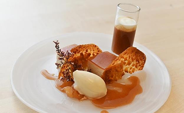 Para refrescar, como pre-postre, un muy fino y suave helado de tomillo con flores caramelizadas y chocolate, un postre muy agradable en boca que nos sorprendió muy gratamente. Y, para finalizar, una señora tarta de queso, mundial, impresionante, de las mejores que he comido, con toque de queso azul y en la base una mezcla entre pasta quebrada y bizcocho que me pareció maravilloso, y ya si lo acompañas de helado de queso, el no va más.