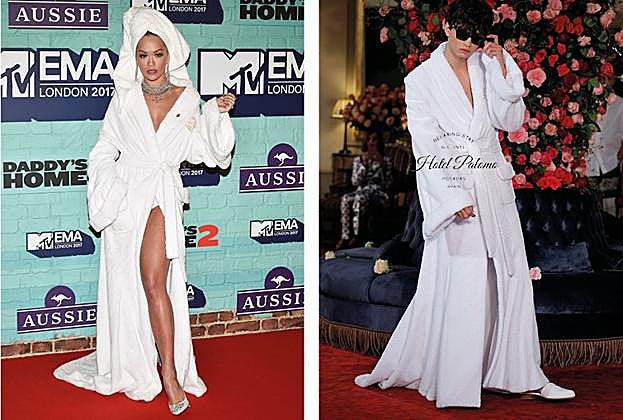 La cantante Rita Ora condujo anoche la gala de los MTV European Music Awards 2017 en albornoz. Pero no en un albornoz cualquiera. Palomo Spain firma el vestido-albornoz largo y su versión corta, con los que la artista posó en la alfombra roja y actuó después sobre el escenario.