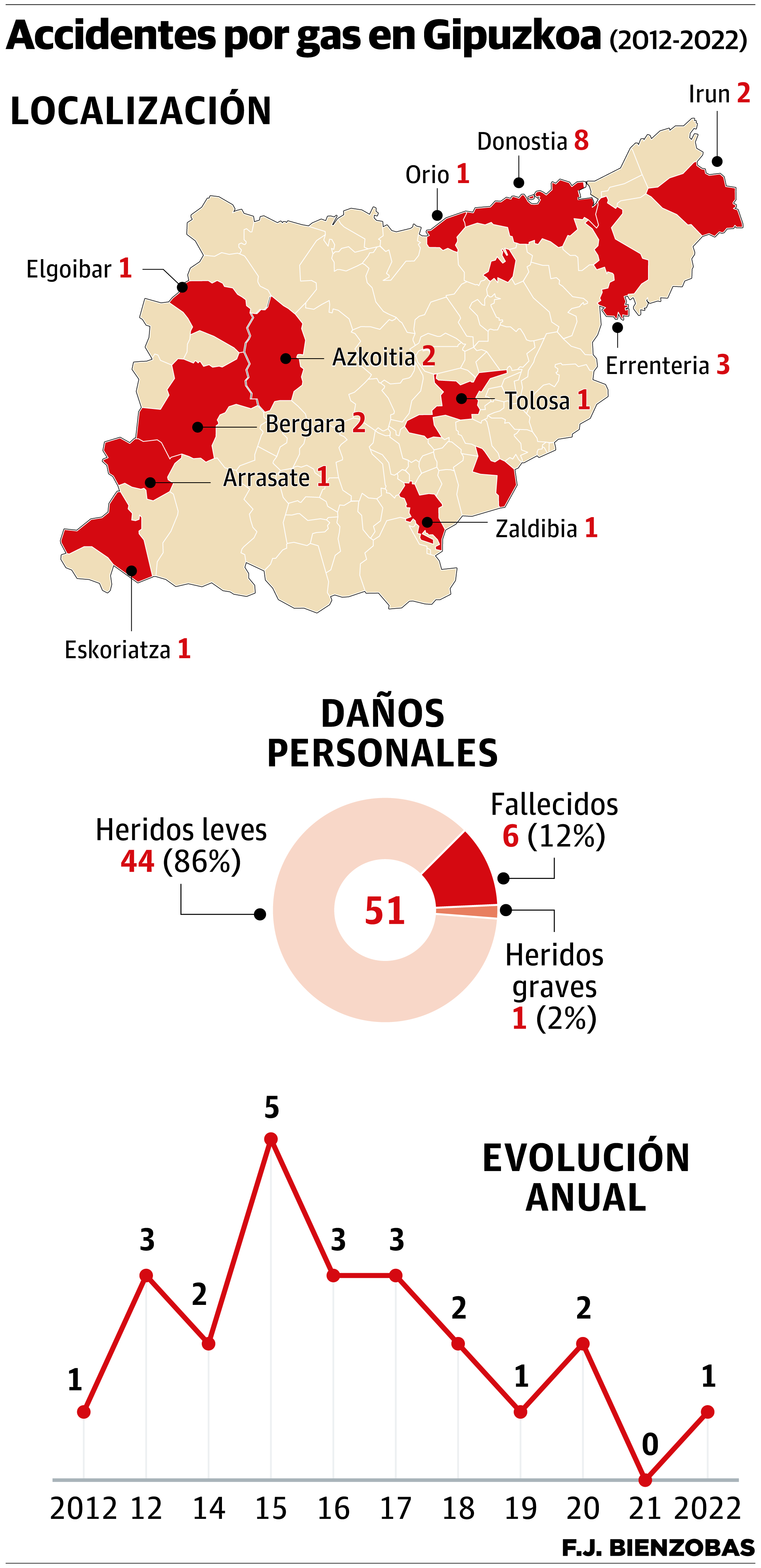 Así consta en la relación de accidentes en instalaciones de gas que maneja el Departamento vasco de Desarrollo Económico, Sostenibilidad y Medio Ambiente, en la que se notifican 24 siniestros durante los últimos 10 años en Gipuzkoa, uno de ellos sin heridos. El resto de los sucesos se han saldado con un herido grave y 44 leves, además de los seis fallecidos. Estos accidentes se han tenido lugar en once municipios del territorio, la mayoría en Donostia (8), seguida de Errenteria (3), Azkoitia, Irun y Bergara, con 2 cada uno, y Zaldibia, Arrasate, Elgoibar, Eskoriatza, Orio y Tolosa, con sendos incidentes.