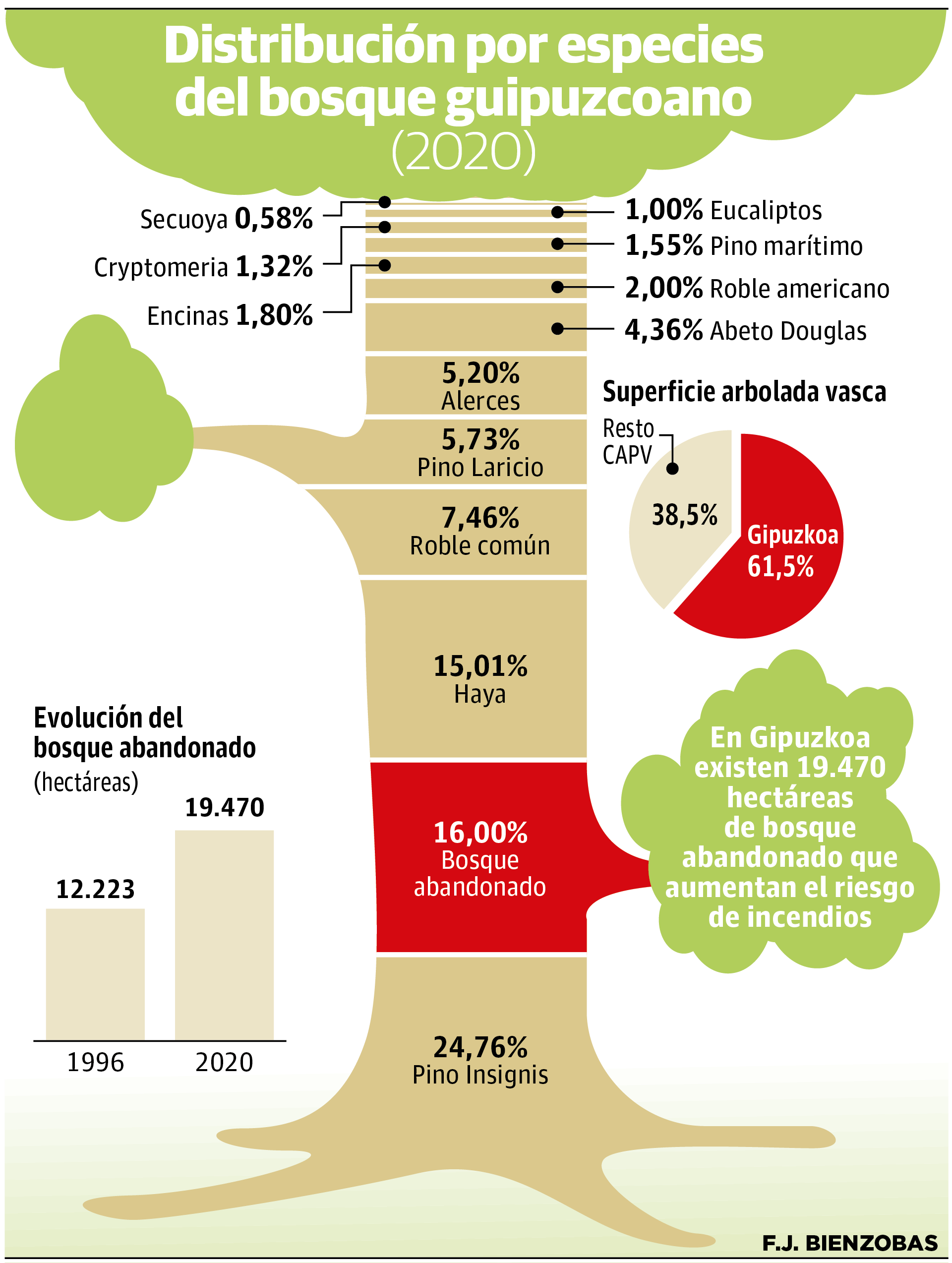 El informe de coyuntura y salud de los bosques de Gipuzkoa 2020 de GEBE señala que de las 37.436 hectáreas abandonadas que hay en Euskadi en la actualidad, más de la mitad (19.470), se encuentran en Gipuzkoa, según ha indicado el presidente de GEBE, Juan Carlos Berraondo. Berraondo considera «preocupante» la evolución del bosque abandonado en este Territorio que en 1996 ocupaba 12.223 hectáreas y ha aumentado un 66% desde entonces. Según ha indicado, «el 92% es de propiedad privada».