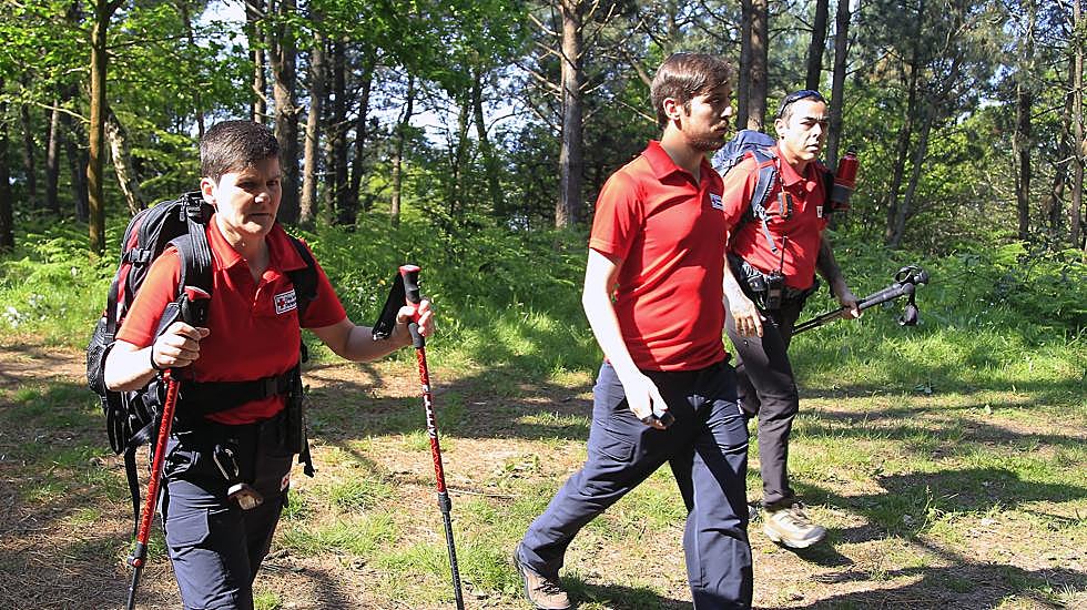 «La víctima es una mujer de unos 60 años. Es rubia y va vestida con una chaqueta rosa. Se ha precipitado por una ladera de Ulia, Donostia, cerca del camino de Santiago». Con estas palabras Fran informa a los otros seis miembros que integran el equipo de respuesta inmediata de la Cruz Roja. Ya conocen a quién van a rescatar hoy. Apoyados en el capó del todoterreno con el que han subido al monte, los voluntarios miran fijamente el mapa y escuchan las directrices de su jefe. No hay tiempo que perder. Tardan segundos en coger el material y se adentran por una pista forestal cercana al lugar donde puede estar la mujer. Fran, de 59 años, mantiene el contacto a través del 'walkie-talkie'. El grupo se divide en dos y todos empiezan a buscar. Es domingo al mediodia, hace sol y hay mucha gente en el monte.