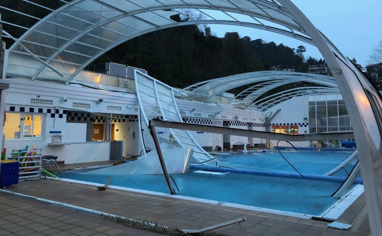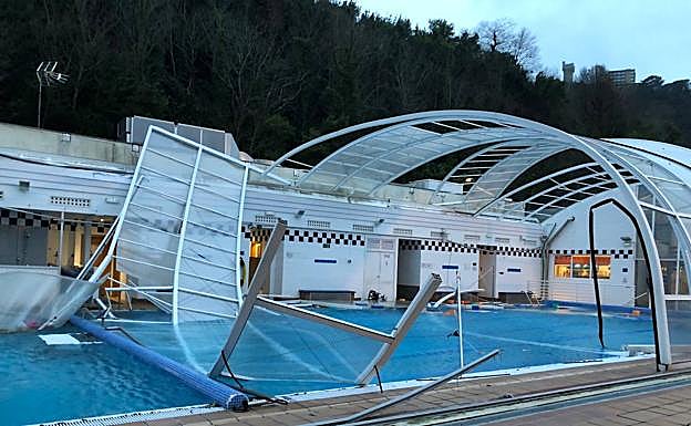 La peor parte del temporal de viento se lo han llevado las instalaciones del Real Club de Tenis de San Sebastián. A las 4.20 horas la cubierta de la piscina ha salido volando. El paso por la zona ha quedado cortado por seguridad, a la espera de que los responsables de la instalación pongan en marcha la reparación.