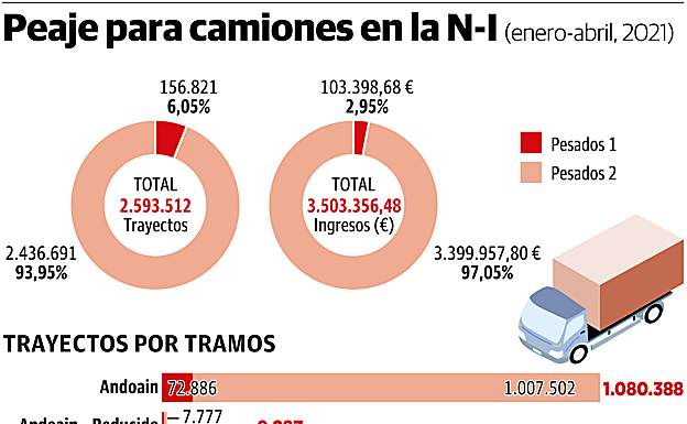 Entre enero y abril de este año, el peaje para camiones de la N-I y la A-15 reportó a Gipuzkoa 3,5 millones de euros, a una media de 875.000 euros al mes, gracias a los cerca de 2,6 millones de pasos registrados. El arco más rentable es el de Etzegarate, con 1,28 millones recaudados, de los que 1,23 millones corresponden a los camiones más grandes, los de más de 12 toneladas.