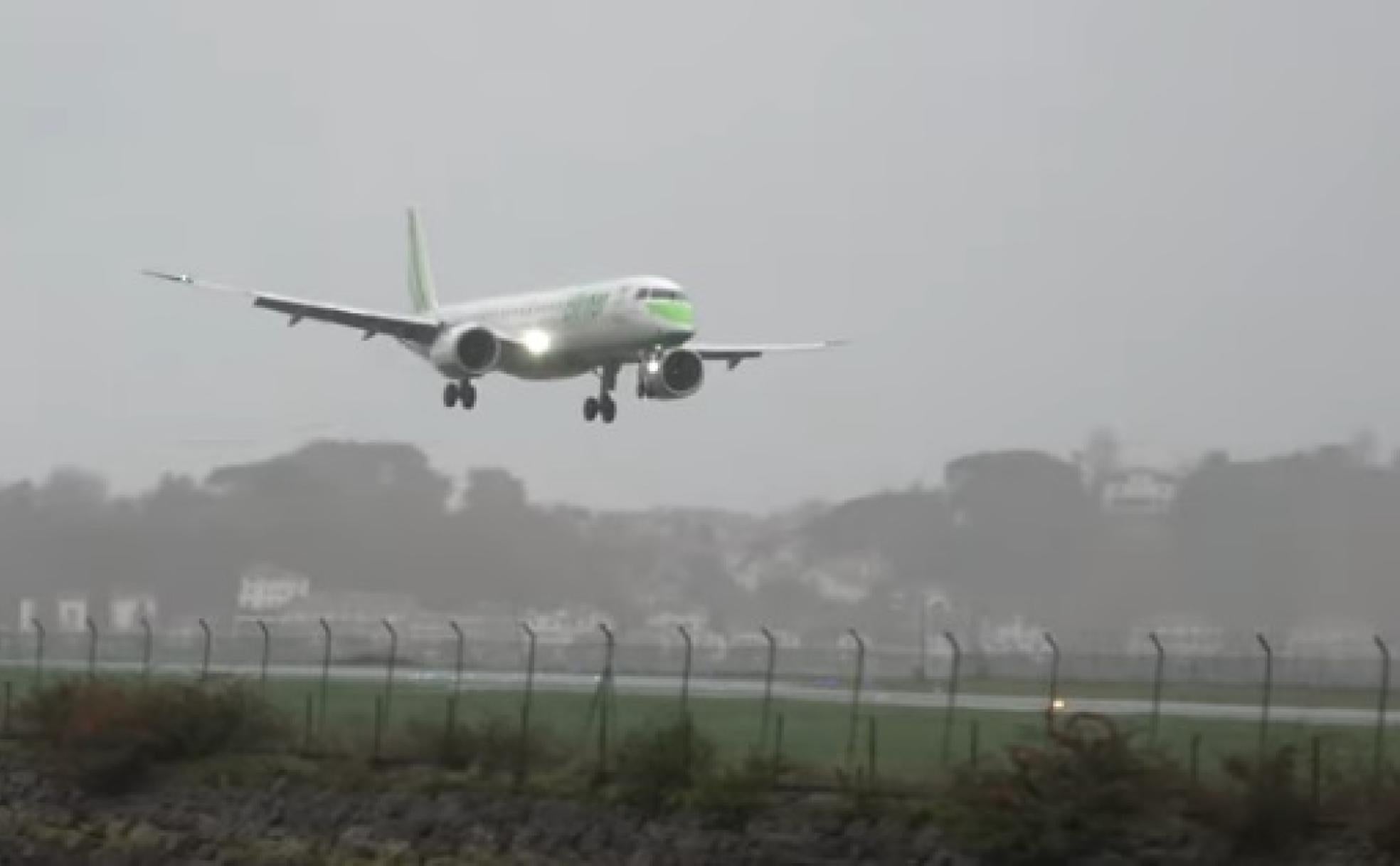 El avión de la compañía Binter despegó a las 8.30 horas desde Gran Canaria con destino San Sebastián. Bajo un tremendo aguacero y un fuerte viento, la aeronave asomó por la costa guipuzcoana sobre las 12.15 horas. Con el piloto a los mandos, el avión descendió hasta la pista y con una espectacular frenada el Embraer E195-E2 aterrizó en el aeropuerto de Hondarribia, tal y como puede verse en el vídeo grabado por Gustavo Ortega (su canal en YouTube: Spotting and the more).