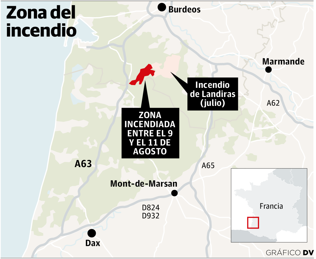 Por el momento, el incendio de las Landas no tiene un buen pronóstico a corto plazo. Así lo avisó la Prefectura de Nueva Aquitania y Gironda (el equivalente a una Subdelegación de Gobierno). «Las condiciones son especialmente difíciles», reconocen las autoridades, que prácticamente no han visto la lluvia en un mes. Las altas temperaturas de hasta 40 grados de los últimos días, la sequedad del aire, así como los meses de sequía que han resecado la vegetación, no son sino leña para la caldera que impulsa el incendio. Según los bomberos galos, las llamas avanzaron este jueves algo más lentamente que la víspera. El riesgo de un reavivamiento es máximo. Según comunicó la Prefectura de la región, este viernes y sábado se espera que el mercurio alcance los 40 grados, lo que genera «un severo riesgo de que se avive el fuego».
