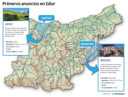 «Ofrezco terreno para pastoreo en Lastur. Tiene una superficie útil de cinco hectáreas, la mayor parte pasto arbustivo. Un río lo divide en dos». ... Este es el primer anuncio que aparece en Gilur, la nueva plataforma puesta en marcha por la Diputación Foral de Gipuzkoa. El segundo terreno ofertado está en Berastegi e incluye la venta del caserío que se encuentra dentro de la parcela, de casi ocho hectáreas con huerta, praderas y monte bajo. En los próximos meses, este portal se irá llenando de propietarios de tierras que quieren vender y personas interesadas en adquirirlas. Por lo menos, esa es la intención del ente foral con esta plataforma que pretende «facilitar la transmisión de explotaciones y tierras agrícolas».