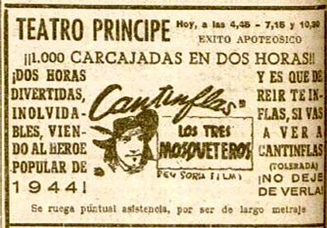 Empezamos con el anuncio de una película, terreno habitualmente propicio para la exageración. Se trataba de la versión paródica de 'Los tres mosqueteros' que protagonizó Cantinflas y se proyectaba en el Príncipe donostiarra, entonces de sala única…