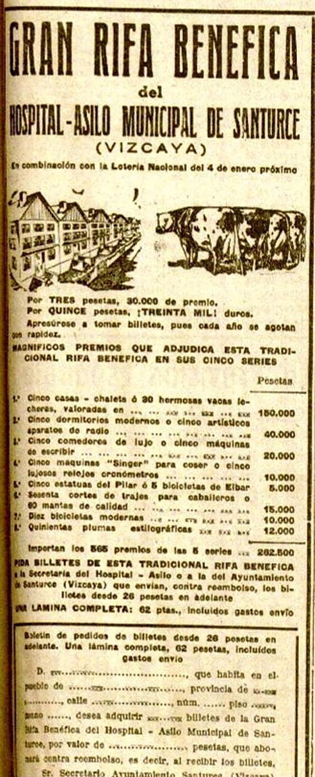 Nos vamos con un último anuncio que publicó DV el 29 de noviembre de 1944, y que no tiene desperdicio. Durante décadas, la rifa benéfica del Hospital-Asilo Municipal de Santurce creada en 1923 fue muy popular, por lo llamativo de sus premios y porque se promocionaba mucho más allá de Bizkaia. Fíjense en lo que la suerte te podía traer hace ochenta años…