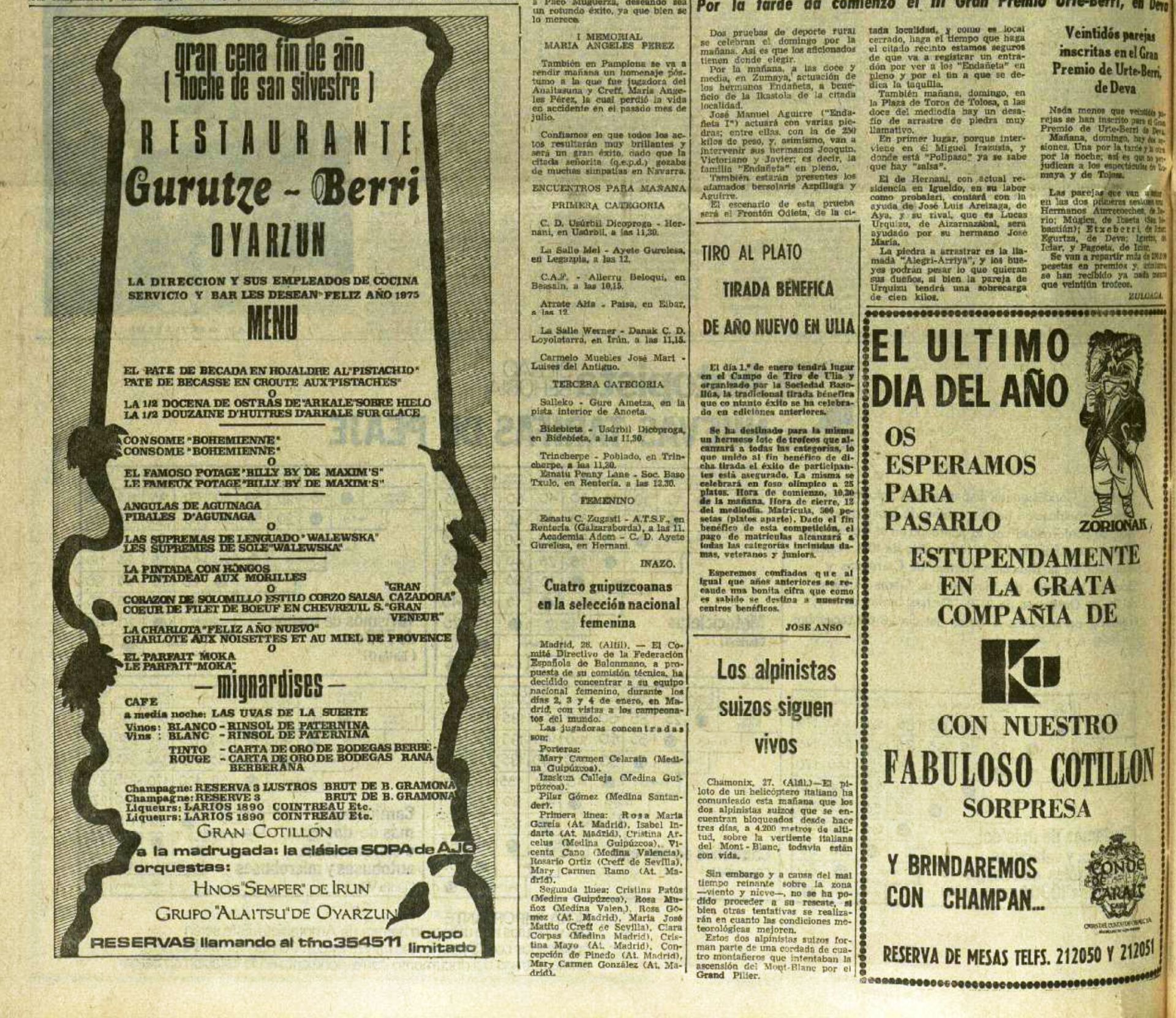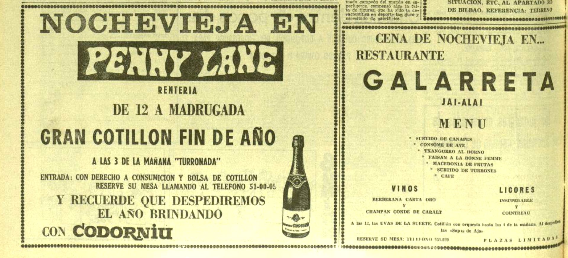 La oferta de aquella Nochevieja para recibir 1975 parecía no tener fin. Nos despedimos con dos últimas opciones, mover el esqueleto y tomar turrón en la discoteca Penny Lane de Errenteria, o cenar antes de bailar al son de una orquesta en el restaurante Galarreta Jai-Alai…
