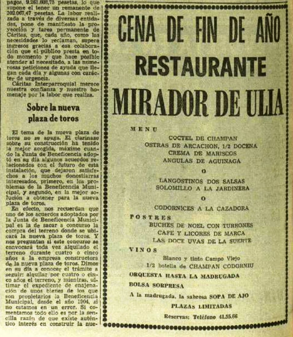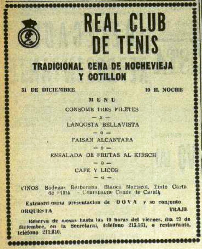 Se habrán fijado que los anuncios de las cenas de fin de año no incluían sus precios. Había que telefonear para descubrir lo que costaba aquella noche especial. Sin embargo, entre las inserciones publicitarias de 1974 había una, con angulas y confit de canard en el menú, que sí informaba de su tarifa…