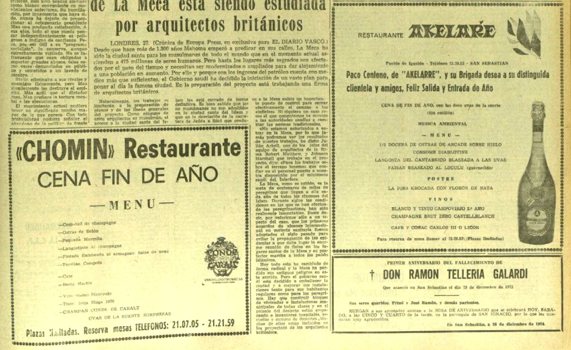 Viajamos cincuenta años atrás para revisar la amplia oferta guipuzcoana de cenas de Nochevieja y cotillones para despedir 1974