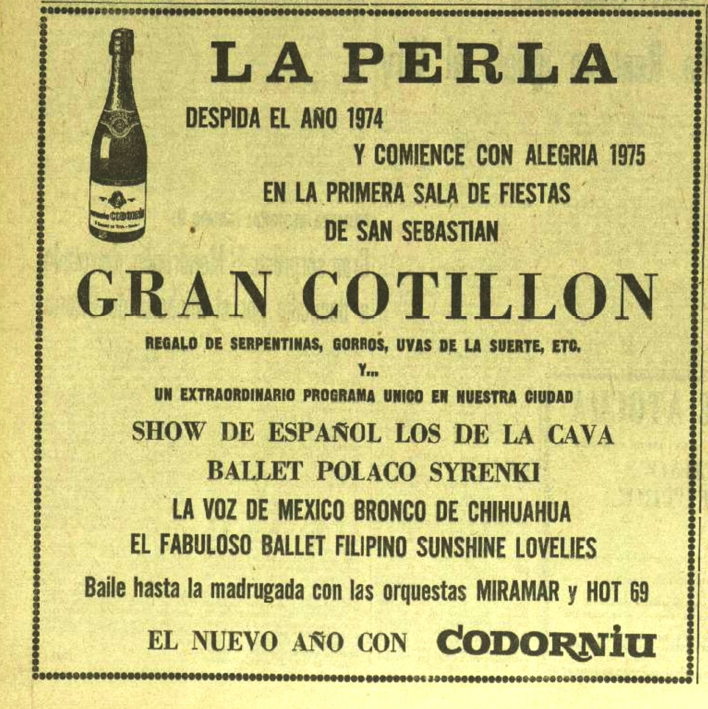 Pasamos de las cenas a los cotillones. El más internacional de la Nochevieja guipuzcoana de 1974-75 era el de La Perla, con actuaciones en directo procedentes de España, Polonia, México y Filipinas…