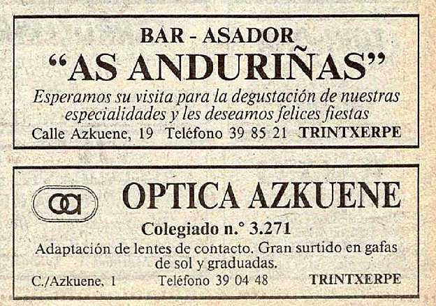 Por supuesto, los lectores recordarán otras muchas ópticas guipuzcoanas cercanas a ellos, desaparecidas o que permanecen, como esta de Trintxerpe cuyo anuncio encontramos hace cuarenta años, en el verano de 1985…