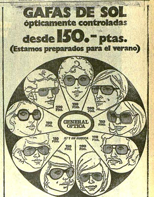 Pero antes, en el repaso a algunos viejos anuncios de gafas y ópticas que les proponemos hoy, empecemos con un ramo de gafas de sol «ópticamente controladas» que en 1974 costaban entre 150 y 750 pesetas…