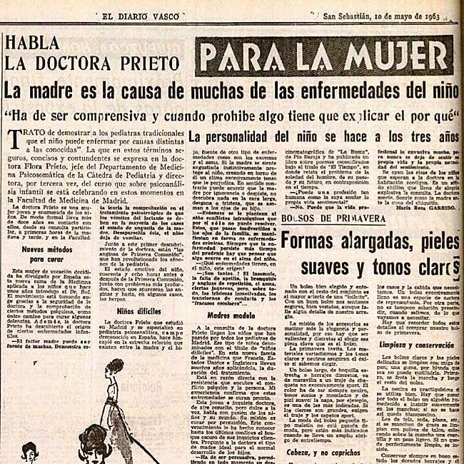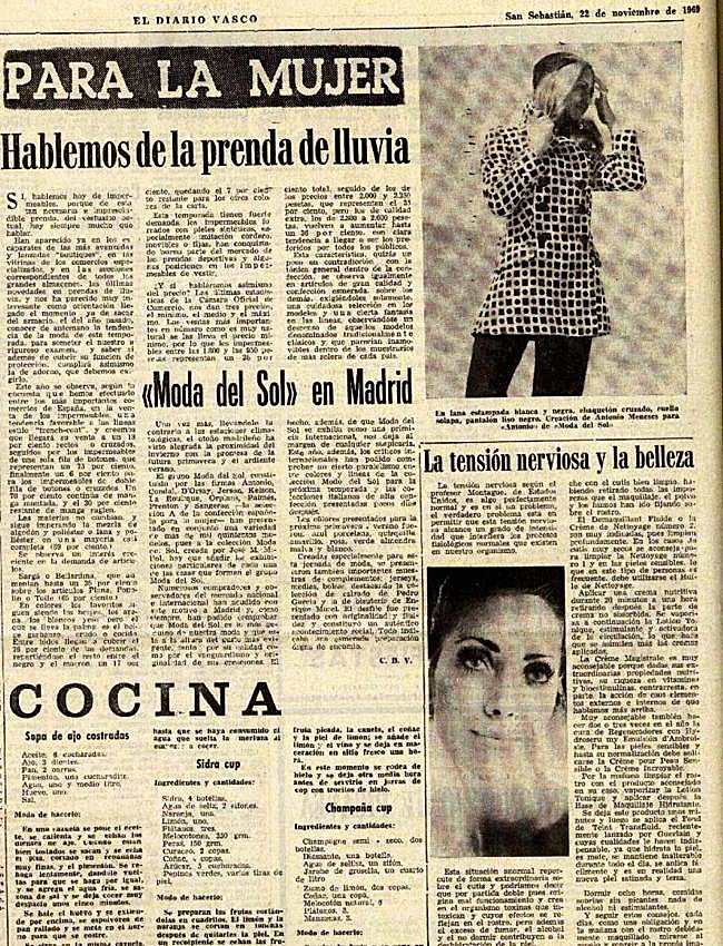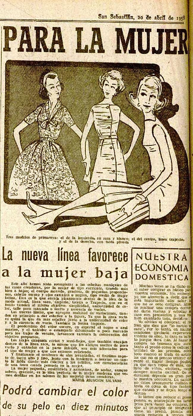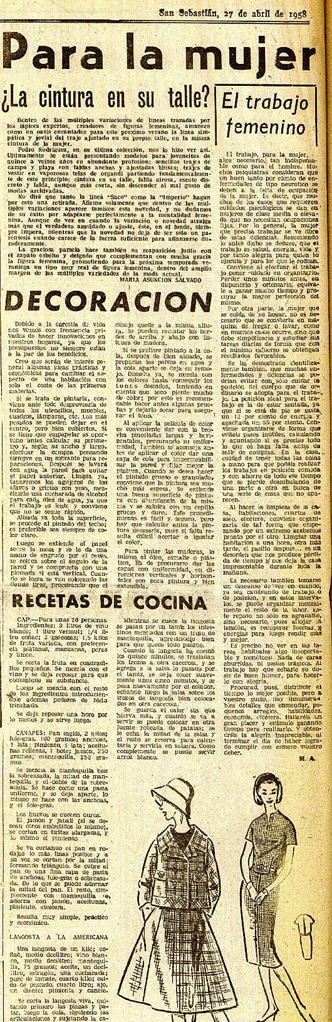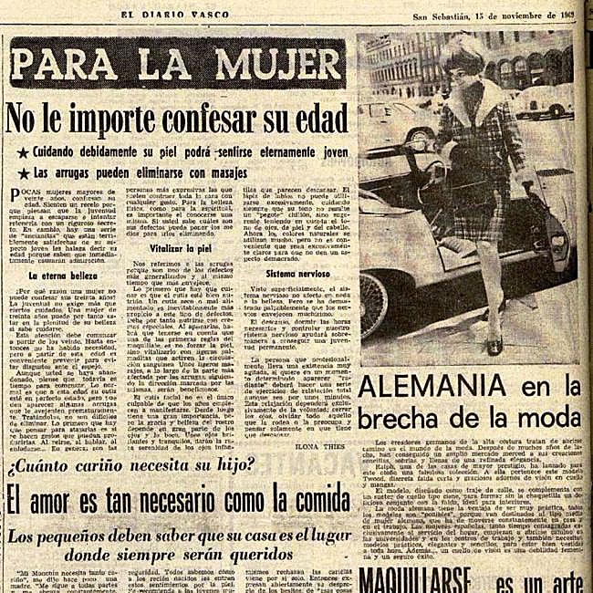 Era otra sociedad, en la que se entendía necesario ofrecer espacios específicos a esos asuntos que interesaban a las mujeres (al parecer, sólo a ellas). ... Y así, hija de su tiempo, en EL DIARIO VASCO se publicó una sección semanal durante los años 50 y 60, y comienzos de los 70, titulada inequívocamente 'Para la mujer'. Se mezclaban en ella temas de moda, belleza, decoración, cocina,.. con otros menos superficiales, relacionados con la economía doméstica, la crianza de los hijos, la sicología y otras preocupaciones de ellas, siempre al estilo de entonces.