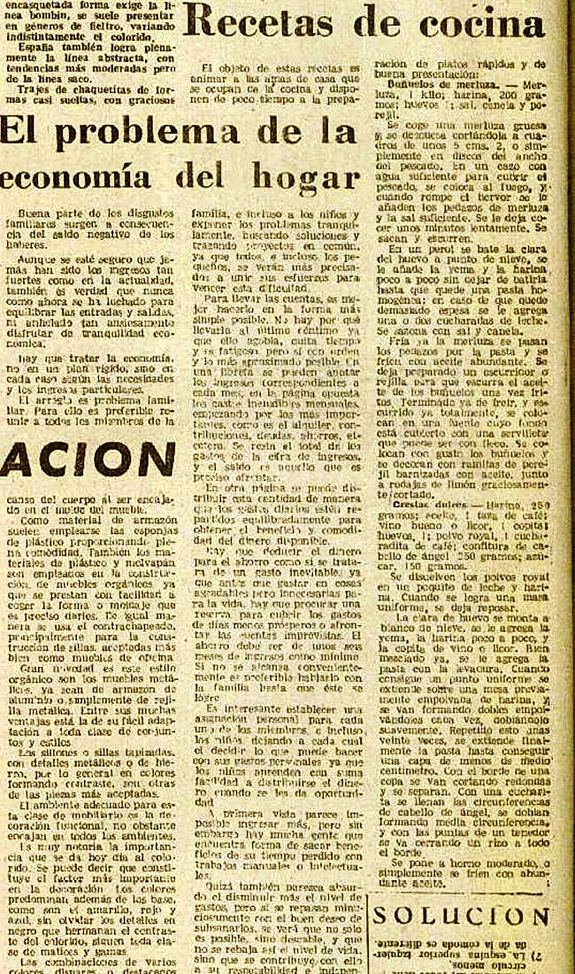 La entrega del 20 de abril de 1958, por ejemplo, informaba de que las tendencias de la moda favorecían entonces a la mujer de talla baja, explicaba los nuevos tintes de pelo, publicaba la receta de la langosta con mayonesa (no era tan cara y otras semanas aparecerían recetas con coliflores, patatas y productos más modestos) y daba algunos consejos sobre economía doméstica…