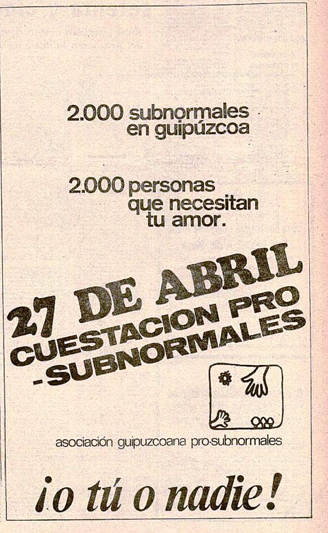 La cuestación anual que entonces se organizaba para recaudar fondos utilizaba sin el menor reparo la palabra subnormales, como comprobamos en la publicidad de abril de 1969…