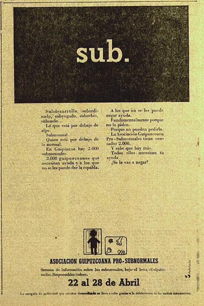 La siguiente publicidad, que encontramos ya en el mes de abril de 1974, jugaba con el prefijo 'sub' y definía 'subnormal' tranquilamente como «quien está por debajo de lo normal»…