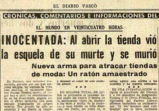 No andaban muy sembrados el 29 de diciembre de 1963, cuando publicaron esta noticia situada en «Beirunt» (en vez de Beirut), igual que no habían estado atinados los tres amigos de un peluquero libanés a quien le habían gastado «una macabra inocentada». Al abrir la persiana de su establecimiento, se encontró con «una gran esquela anunciando su propia muerte. Tan grande ha sido su emoción y tan fuerte la impresión, que ha caído muerto repentinamente». Al menos, la esquela ya la tenían adelantada (disculpen por el humor negro).