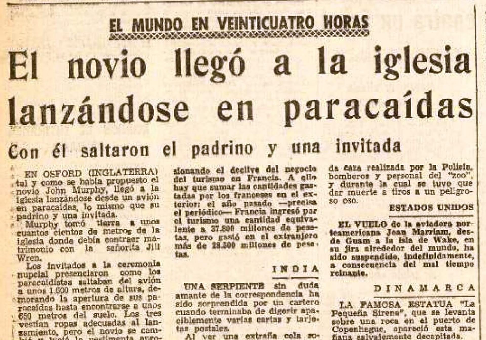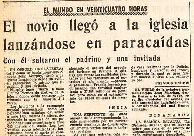 Otra rareza. Por televisión hemos visto bodas en cimas de montañas y en el fondo del mar. En 1964 se hablaba, sin foto que lo atestiguase, de un enlace matrimonial celebrado en Oxford con llegada espectacular al templo…