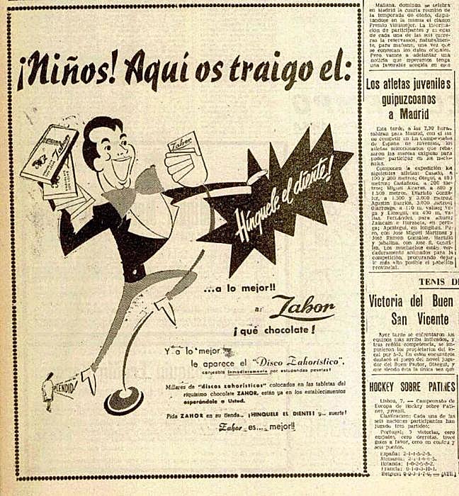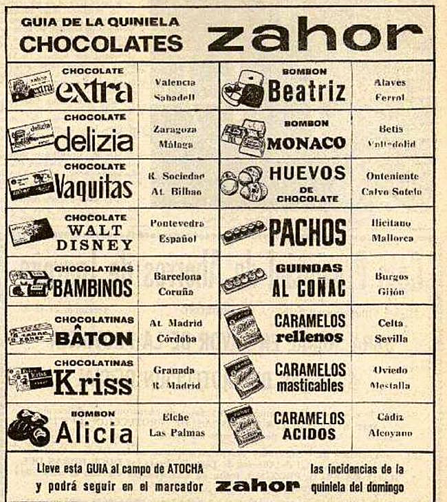 Las firmas de chocolates desarrollaron amplias gamas de dulces productos. Así lo hizo, por ejemplo, Zahor, la empresa que nació en San Sebastián y se trasladó a la chocolatera Oñati. Como recordamos alguna vez, en 1969 monopolizó las claves para comprender los resultados de los partidos del marcador simultáneo de Atocha. Ya nos tomaríamos una degustación de tabletas de chocolate, chocolatinas, bombones y huevos de chocolate…