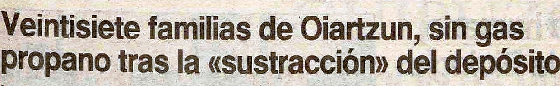 «La comunidad de vecinos Erriberane de Oiartzun ha formulado una denuncia ante el departamento de Medio Ambiente de Guipúzcoa por la licuación y posterior quema de cuatro mil litros de gas propano, que les fueron sustraídos previamente por la empresa Construcciones Amenábar SA, 'sin la autorización pertinente', según han señalado los propios vecinos. Este hecho tuvo lugar el pasado 9 de octubre y desde entonces varias decenas de familias que residen en el citado grupo de viviendas permanecen sin poder hacer uso de agua caliente ni de la calefacción, al carecer del correspondiente depósito».