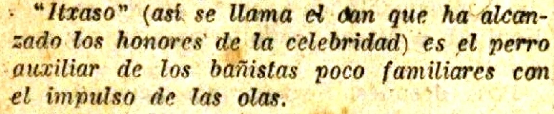 Vamos, que el perro Itxaso era todo un bañero y casi socorrista, a cambio de muy poco: «En pago a sus servicios recibe las caricias de Concha y Carlota Parellada, Amparo Pérez Bueno, María Madroga, Lola Sagarra, Chefita López Kaiser, Carmen de la Vega, Araceli Sauras, Pilar Izquierdo, Rosario Calvo, Maruja, Carmen y Elvira Bonet y Pilar Araoz, que comprenden la importancia del perro, que da un carácter peculiar a la playa limpia y abierta de Zarauz».