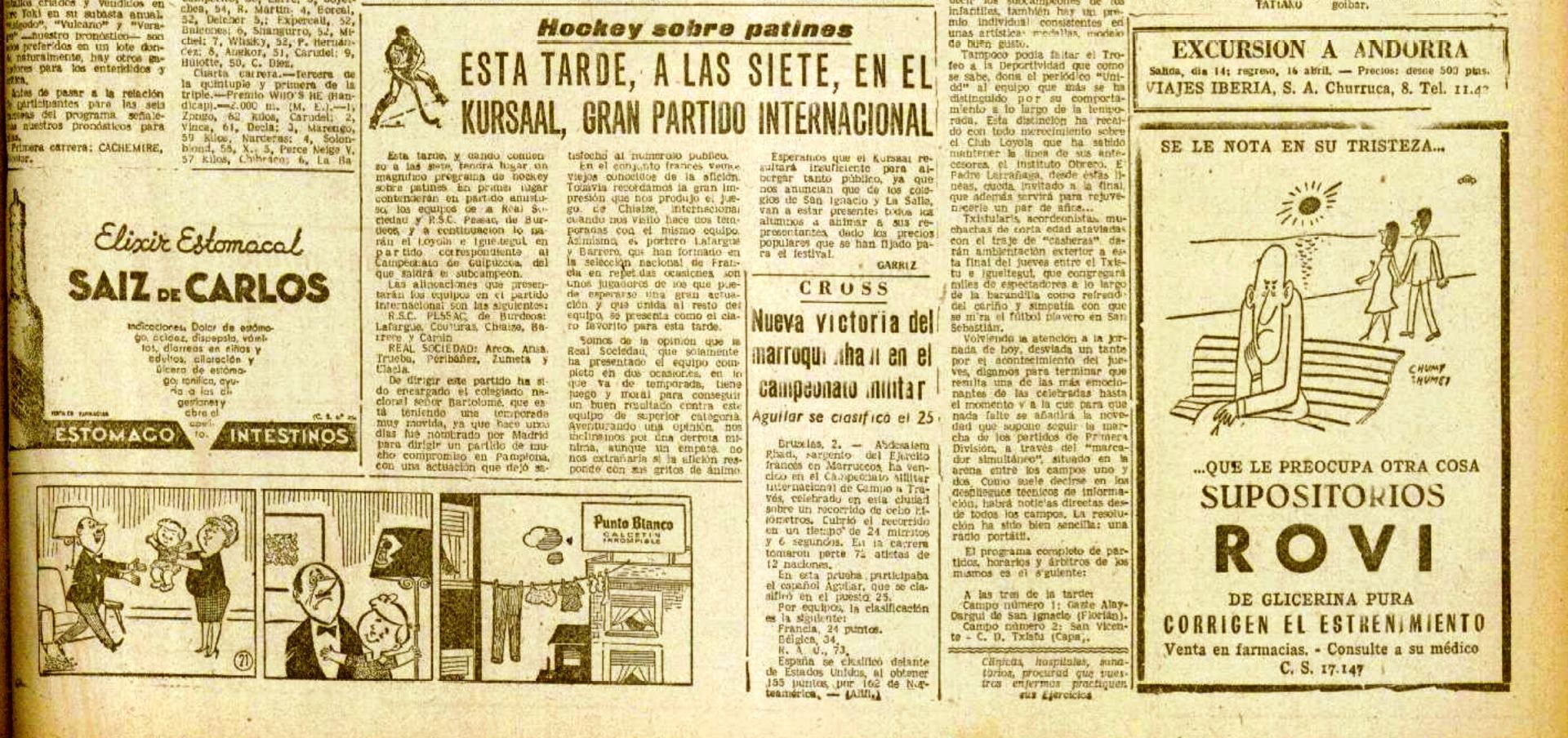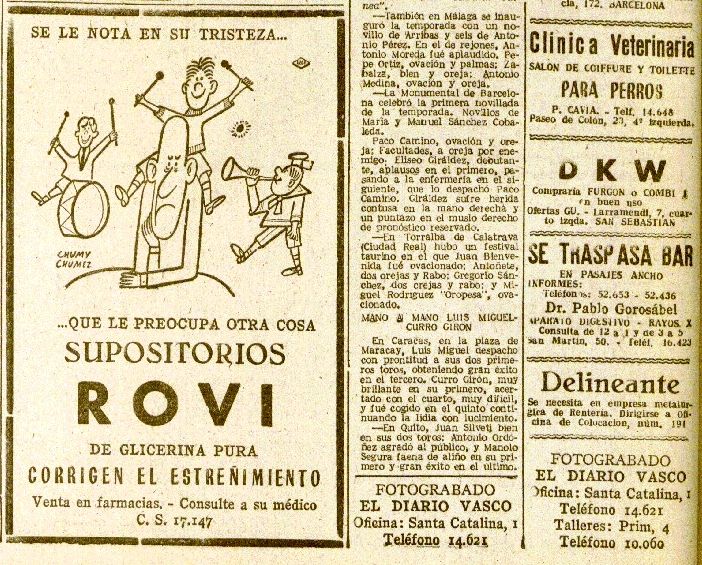 Coincidieron los anuncios con viñetas de Peñarroya con otros de un conocido y muy querido dibujante donostiarra, Chumy Chúmez, como en esta página publicada el 3 de abril de 1960…